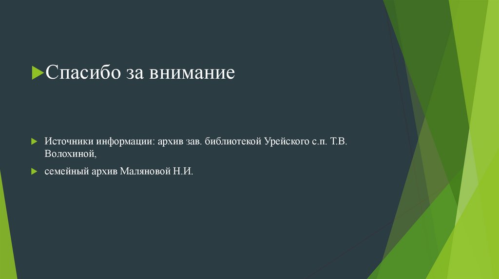 Источники информации: архив зав. библиотекой Урейского с.п. Т.В.