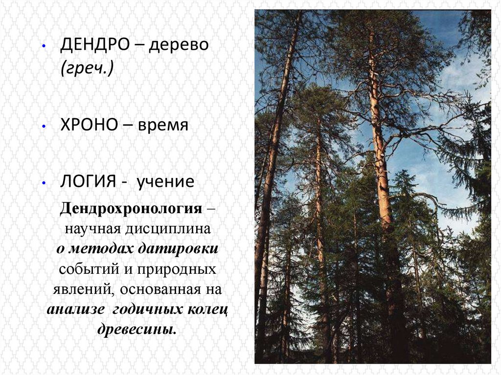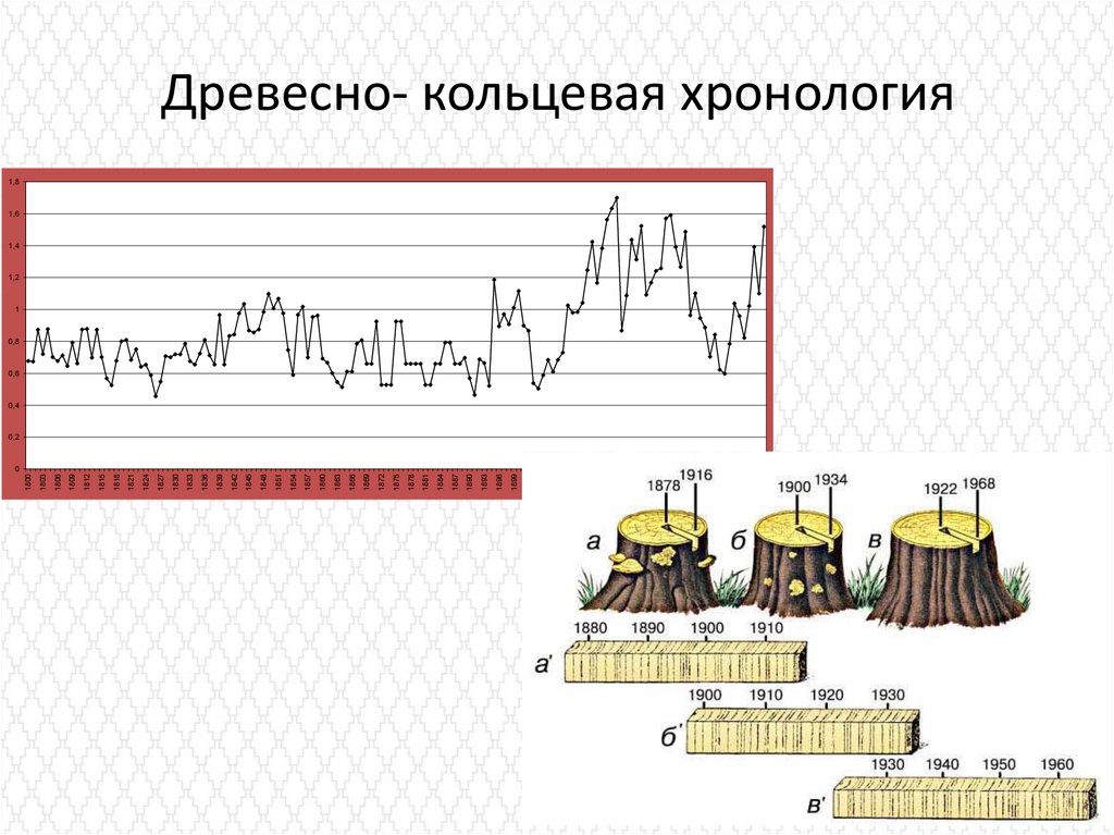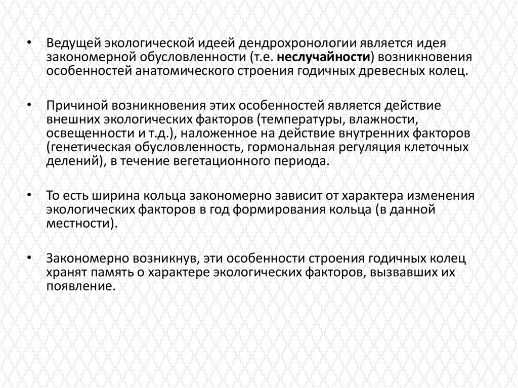 • Ведущей экологической идеей дендрохронологии является идеязакономерной обусловленности (т.е. неслучайности) возникновения