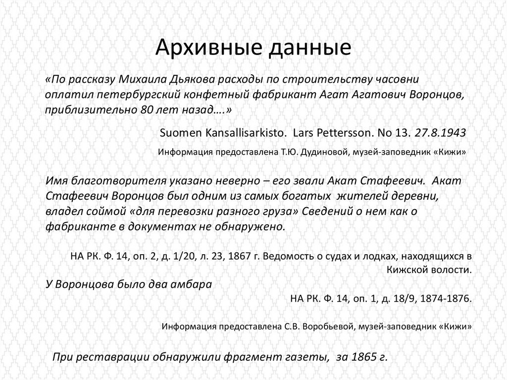 Информация предоставлена Т.Ю. Дудиновой, музей-заповедник «Кижи»