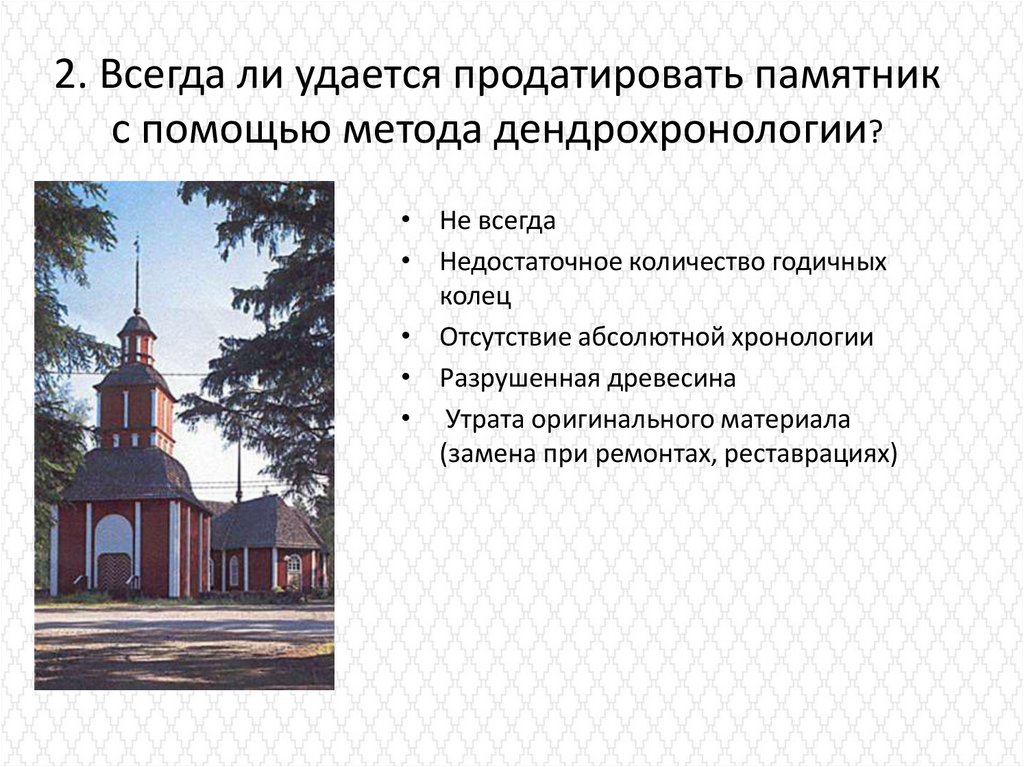 2. Всегда ли удается продатировать памятникс помощью метода дендрохронологии?