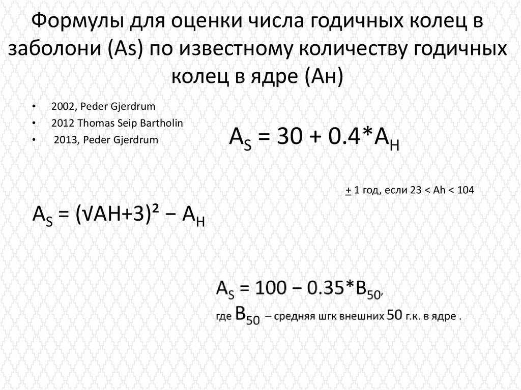 Формулы для оценки числа годичных колец взаболони (As) по известному количеству годичных