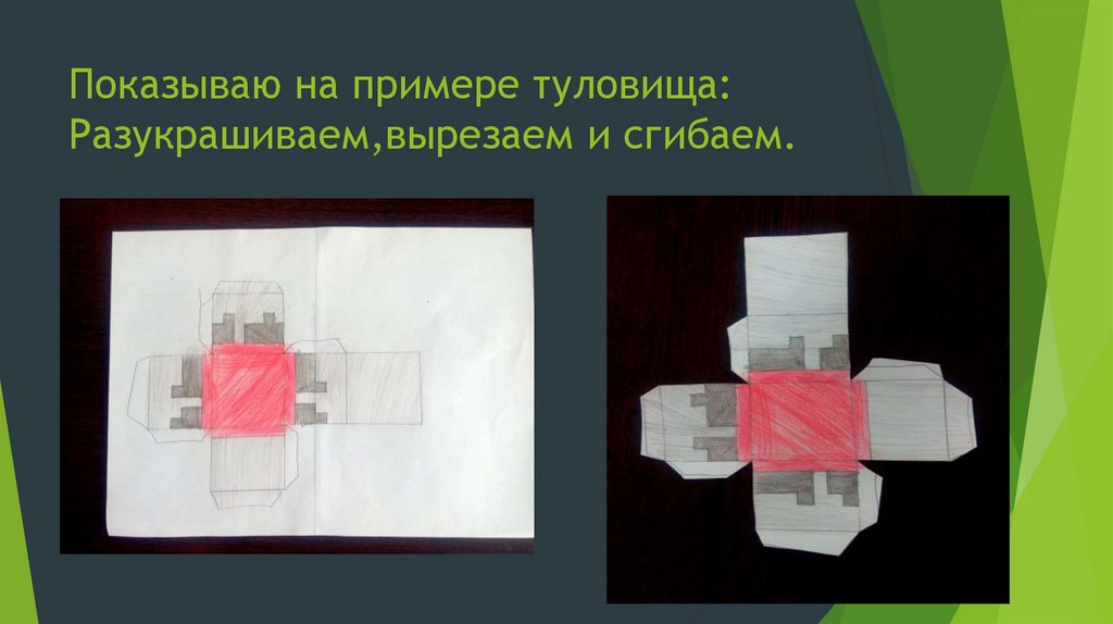 Показываю на примере туловища:Разукрашиваем,вырезаем и сгибаем.