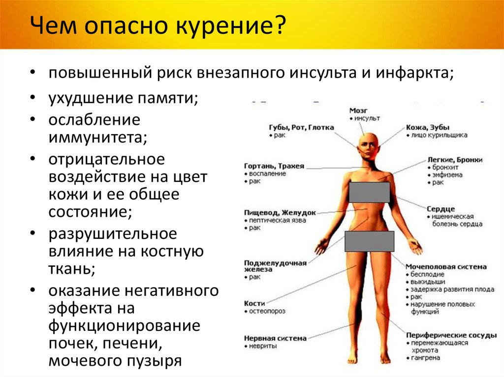 Чем опасно курение?• повышенный риск внезапного инсульта и инфаркта;