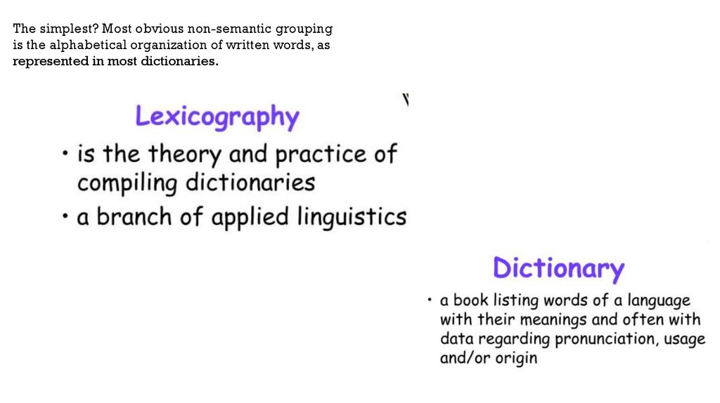 The simplest? Most obvious non-semantic groupingis the alphabetical organization of written words, as