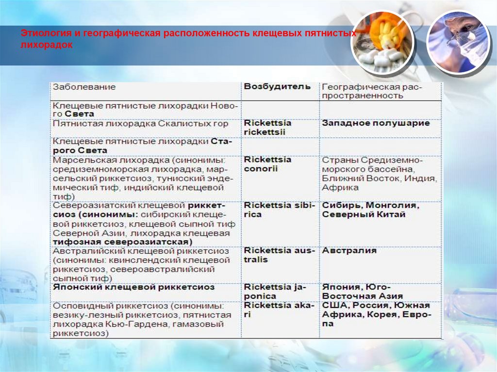 Этиология и географическая расположенность клещевых пятнистыхлихорадок