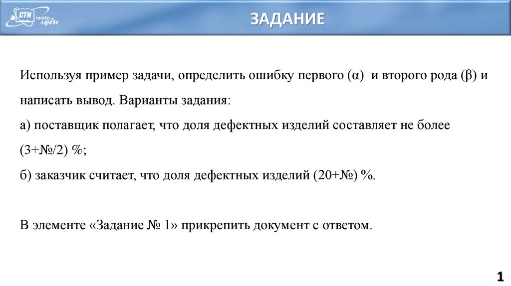 ЗАДАНИЕИспользуя пример задачи, определить ошибку первого (α) и второго рода (β) и