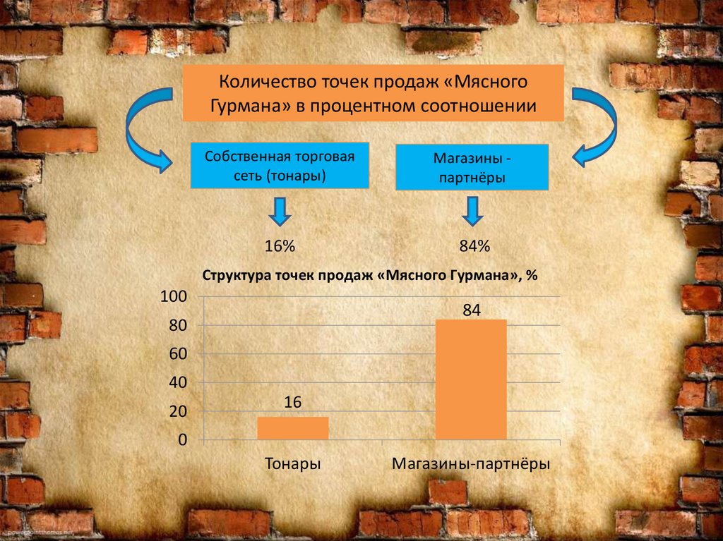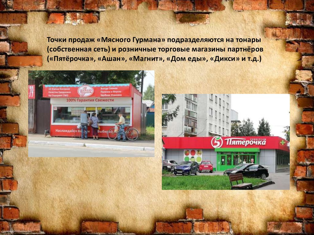 Точки продаж «Мясного Гурмана» подразделяются на тонары(собственная сеть) и розничные торговые магазины партнёров