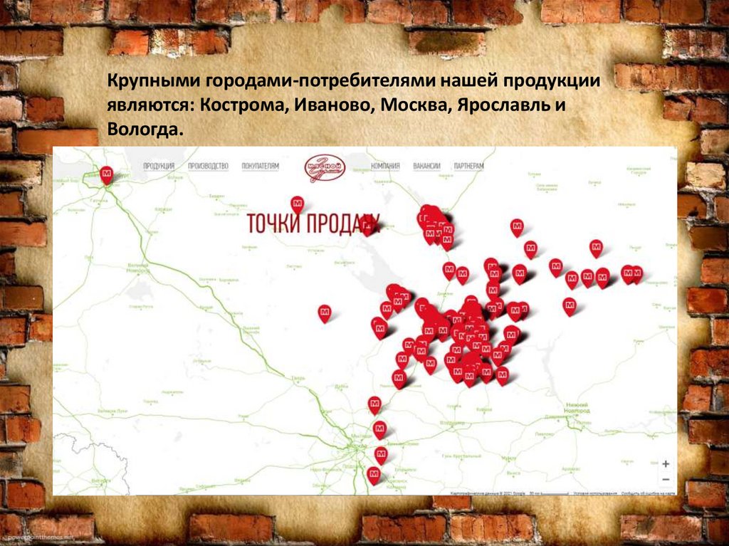 Крупными городами-потребителями нашей продукцииявляются: Кострома, Иваново, Москва, Ярославль и
