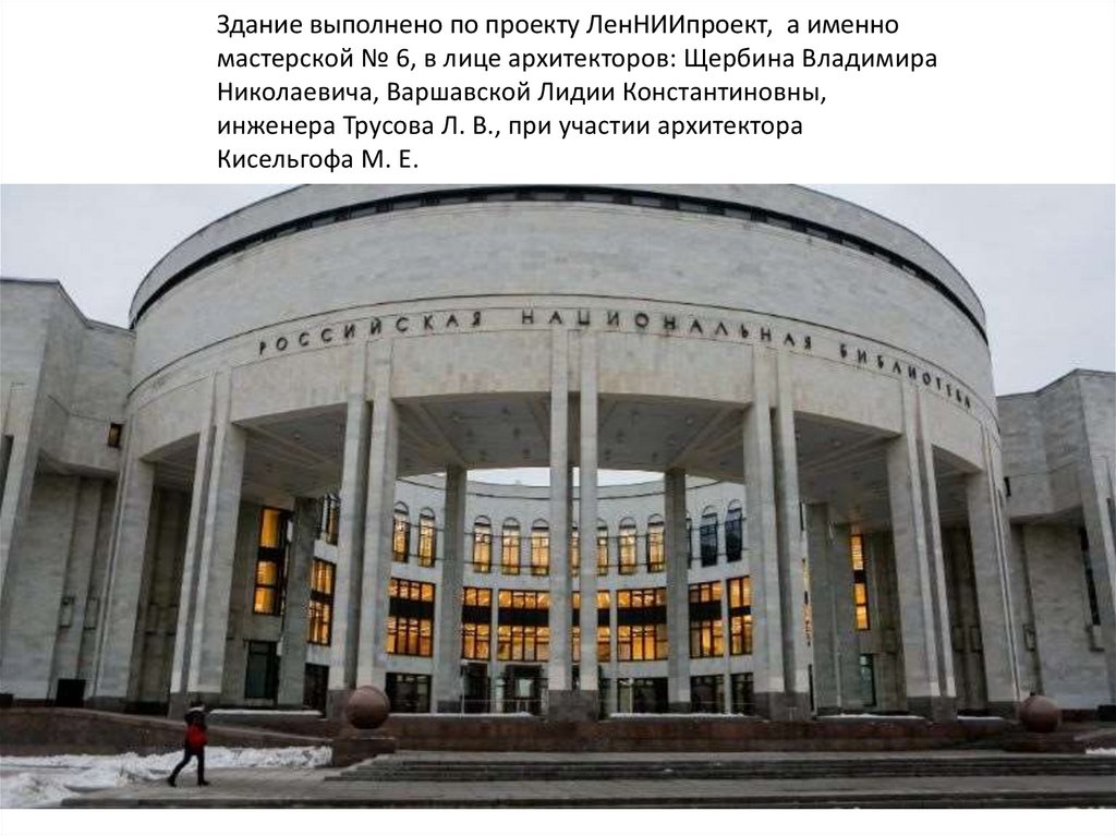 Здание выполнено по проекту ЛенНИИпроект, а именномастерской № 6, в лице архитекторов: Щербина Владимира