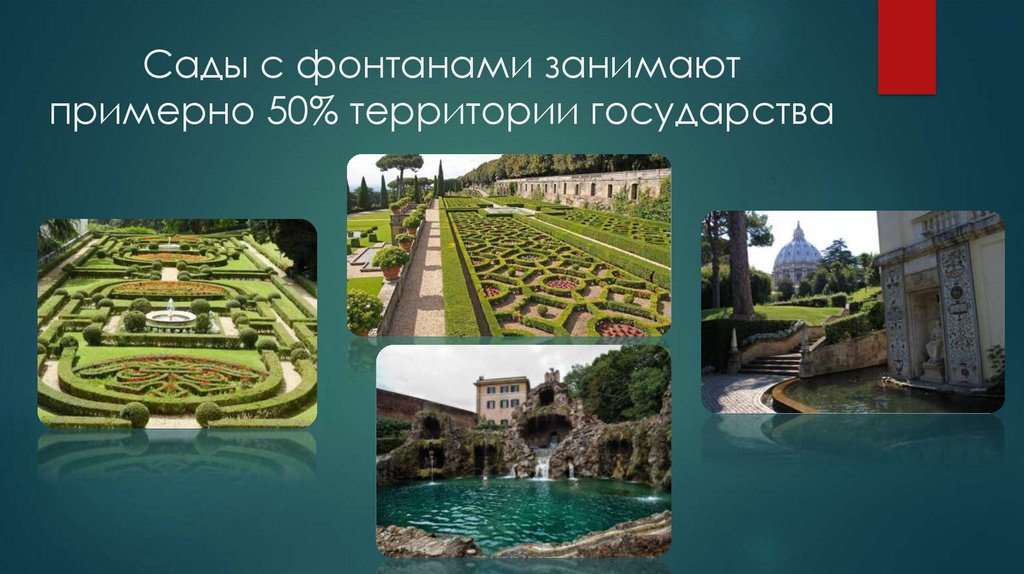 Сады с фонтанами занимаютпримерно 50% территории государства