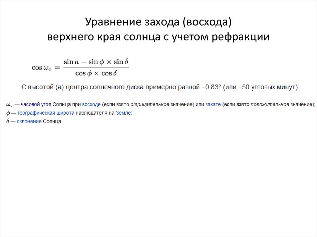 Уравнение захода (восхода)верхнего края солнца с учетом рефракции