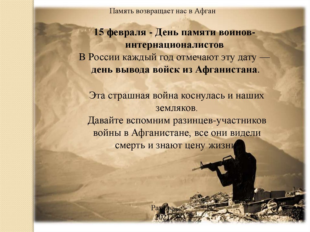 Память возвращает нас в Афган15 февраля - День памяти воиновинтернационалистов