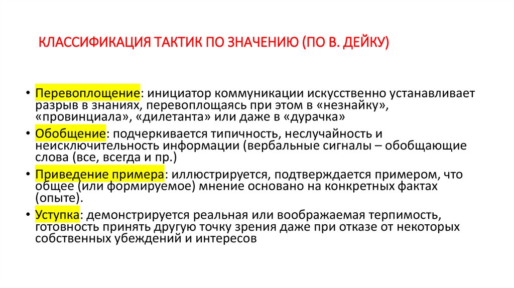КЛАССИФИКАЦИЯ ТАКТИК ПО ЗНАЧЕНИЮ (ПО В. ДЕЙКУ)• Перевоплощение: инициатор коммуникации искусственно устанавливает