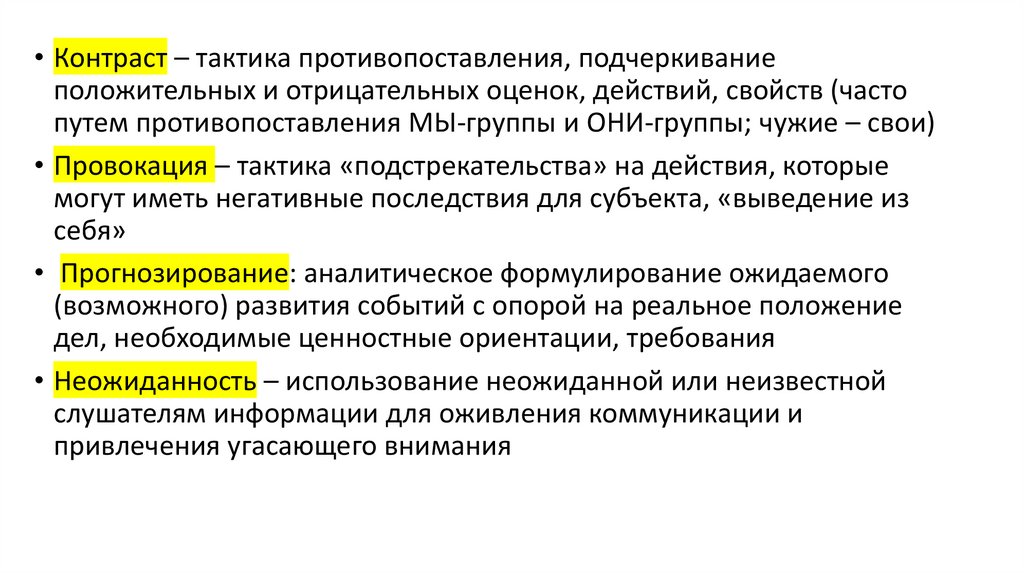 • Контраст – тактика противопоставления, подчеркиваниеположительных и отрицательных оценок, действий, свойств (часто