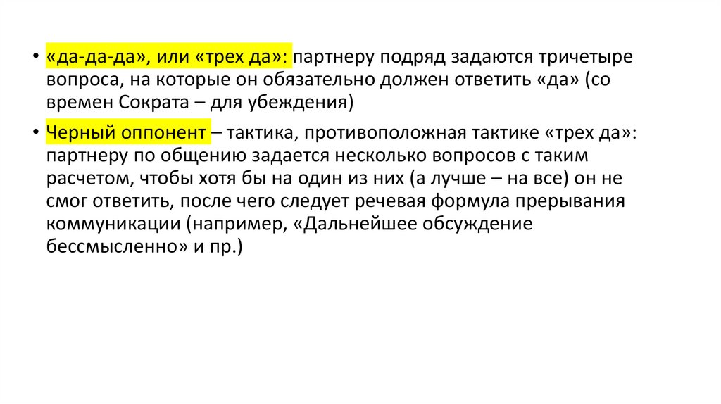 • Черный оппонент – тактика, противоположная тактике «трех да»: