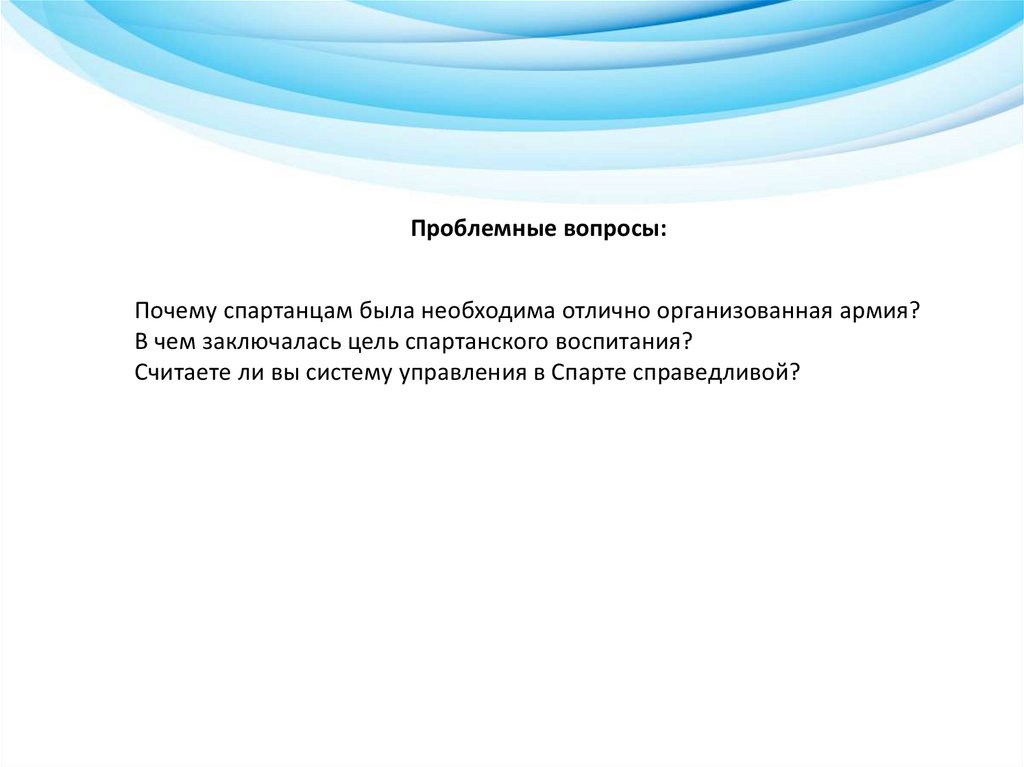 Проблемные вопросы:Почему спартанцам была необходима отлично организованная армия?