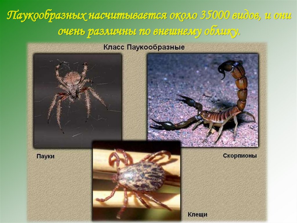 Паукообразных насчитывается около 35000 видов, и ониочень различны по внешнему облику.