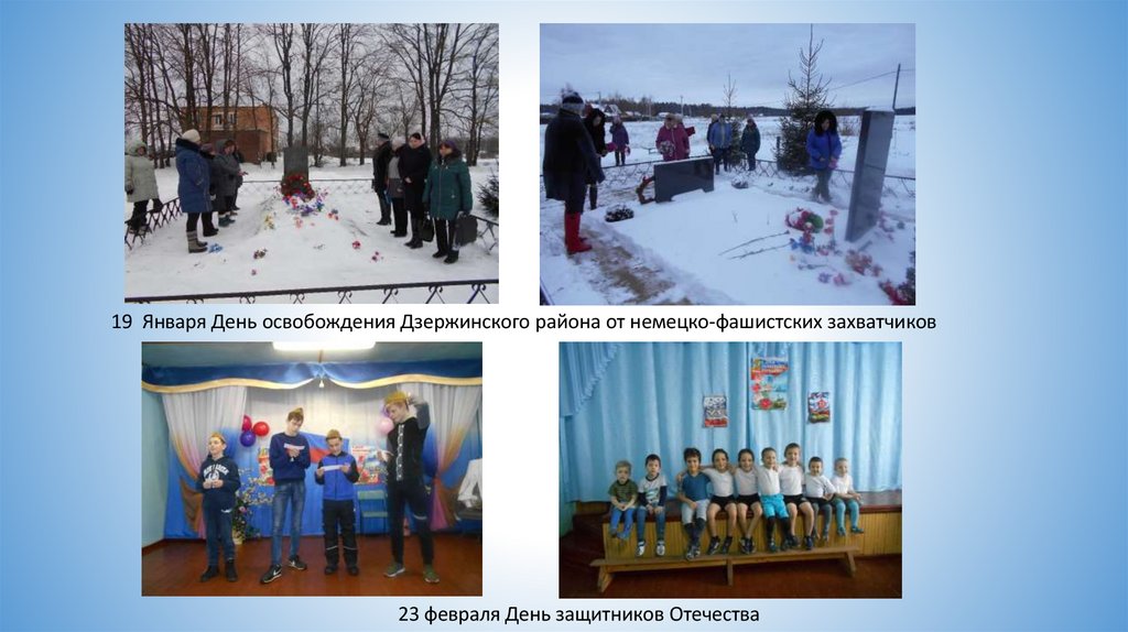 19 Января День освобождения Дзержинского района от немецко-фашистских захватчиков23 февраля День защитников Отечества