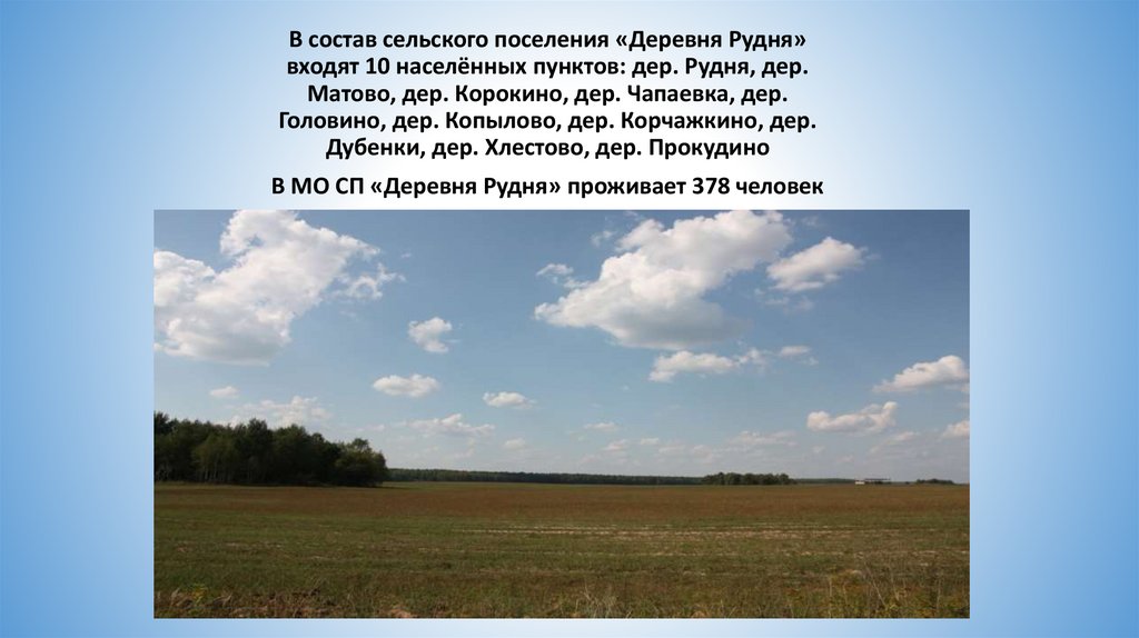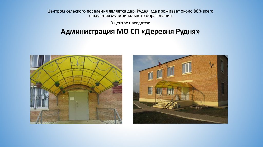 Центром сельского поселения является дер. Рудня, где проживает около 86% всегонаселения муниципального образования