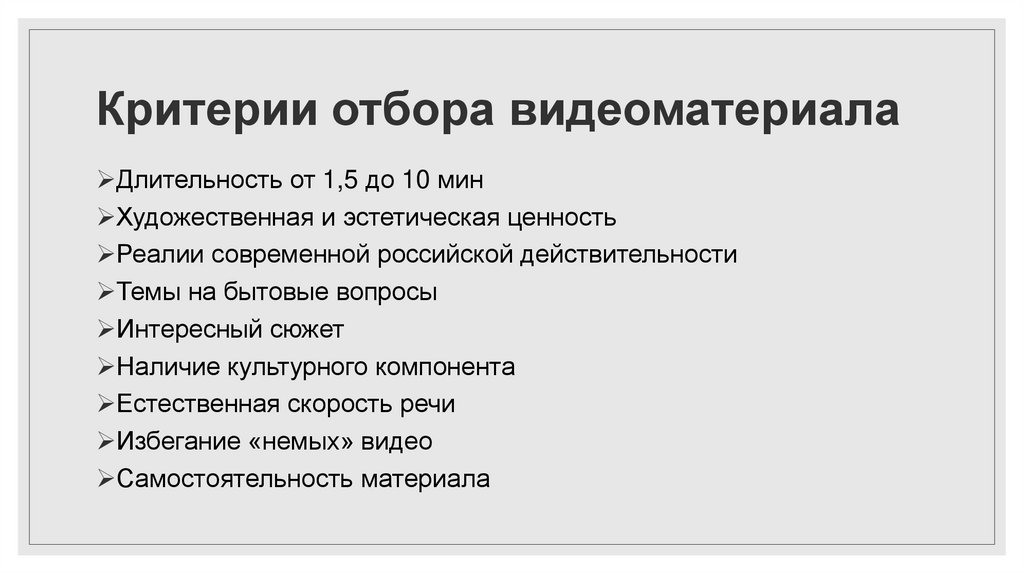 Критерии отбора видеоматериалаДлительность от 1,5 до 10 мин