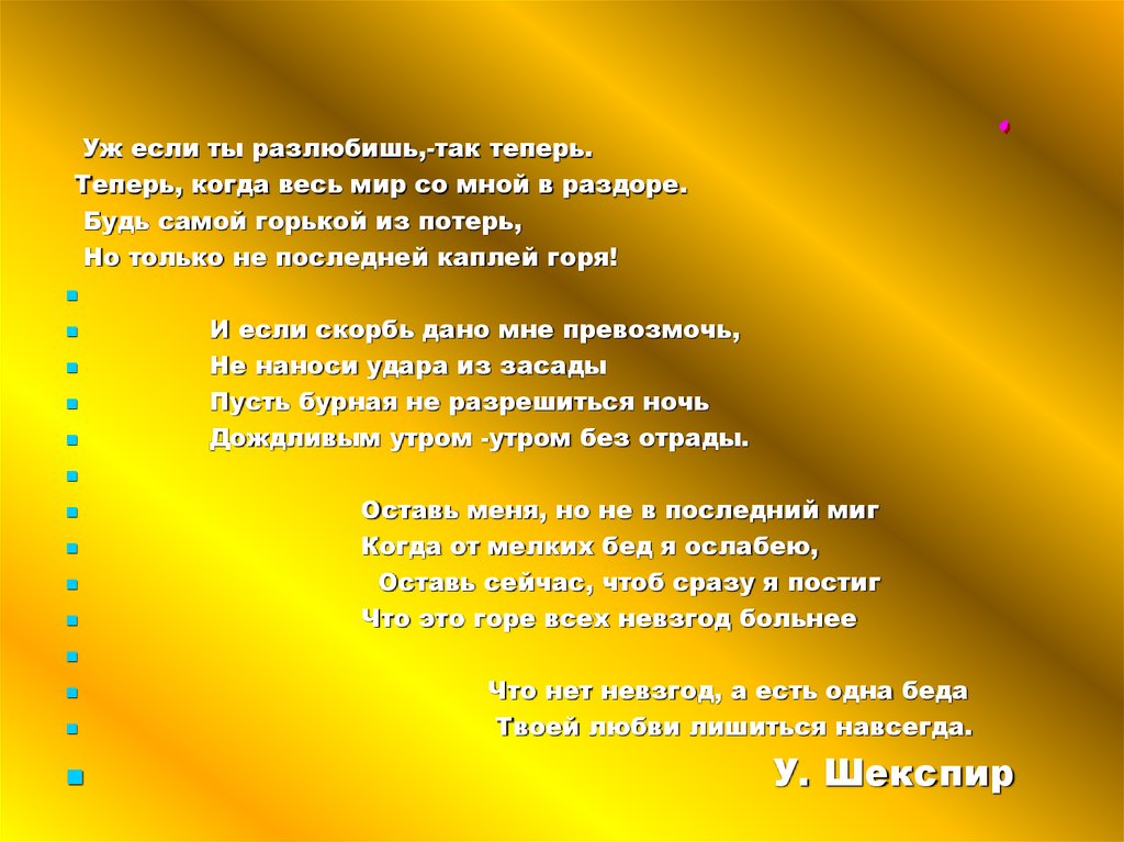 Уж если ты разлюбишь,-так теперь.Теперь, когда весь мир со мной в раздоре.