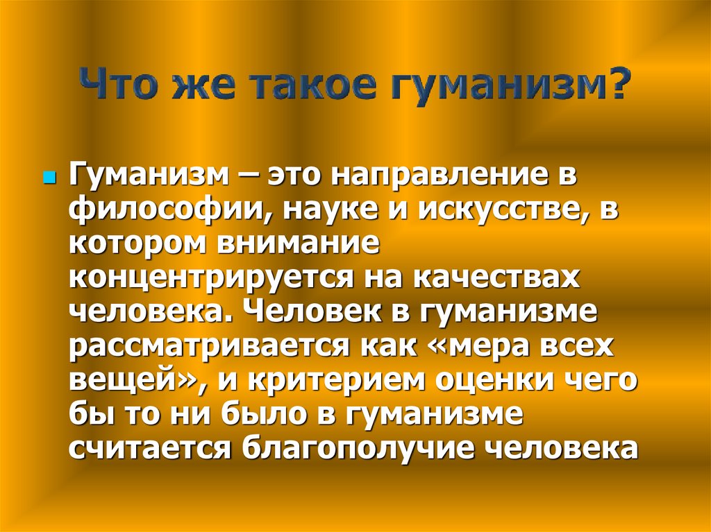 Гуманизм – это направление вфилософии, науке и искусстве, в