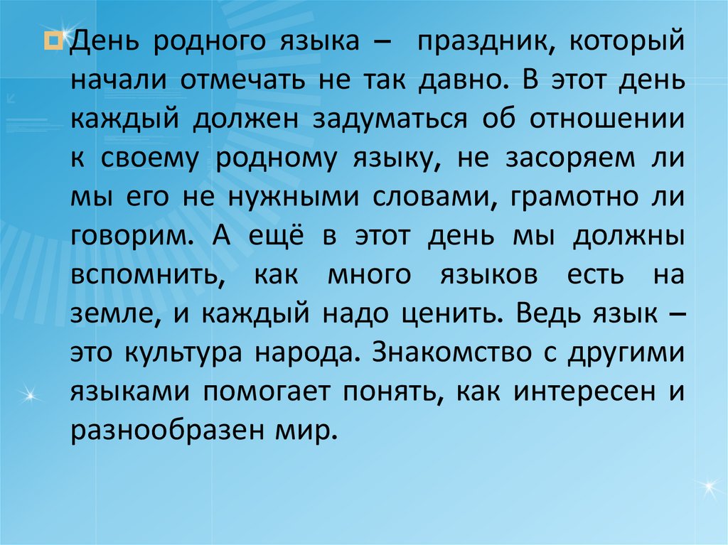 родного языка – праздник, которыйначали отмечать не так давно. В этот день