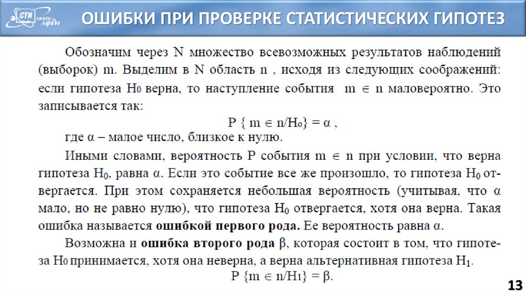 ОШИБКИ ПРИ ПРОВЕРКЕ СТАТИСТИЧЕСКИХ ГИПОТЕЗ13