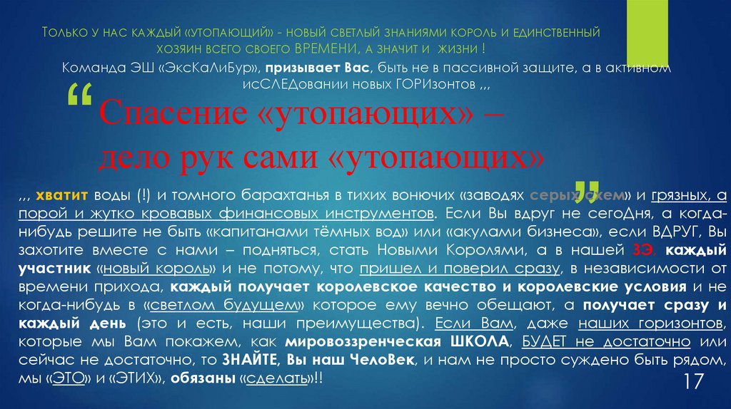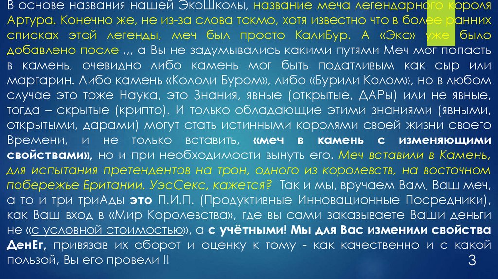 нам остро необходимо для жизни, того что дороже денег. ЭкоШкола "ЭксКаЛиБур" ПриходиТе и получиТе!»