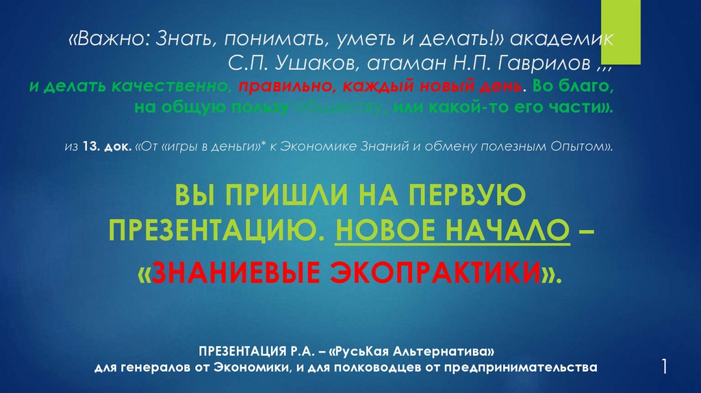 «Важно: Знать, понимать, уметь и делать!» академикС.П. Ушаков, атаман Н.П. Гаврилов ,,,