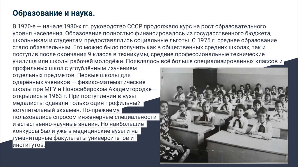 Образование и наука.В 1970-е — начале 1980-х гг. руководство СССР продолжало курс на рост образовательного