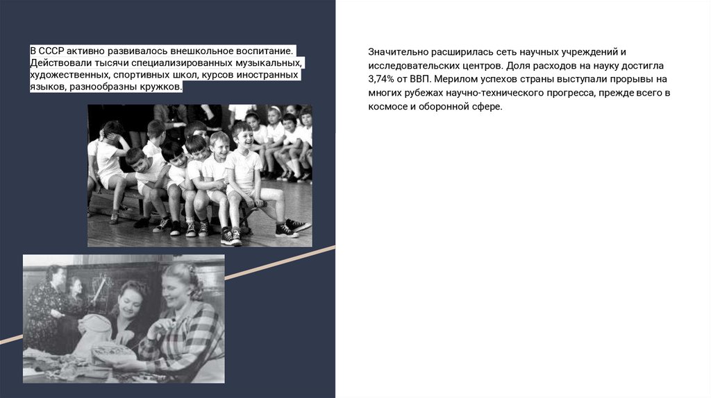 В СССР активно развивалось внешкольное воспитание.Действовали тысячи специализированных музыкальных,