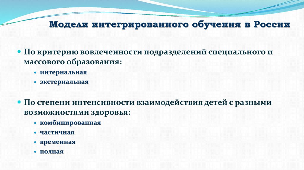 Модели интегрированного обучения в РоссииПо критерию вовлеченности подразделений специального и