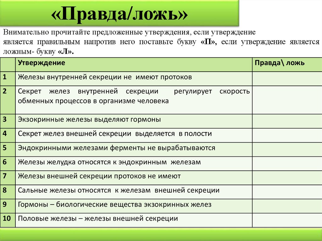 «Правда/ложь»Внимательно прочитайте предложенные утверждения, если утверждение