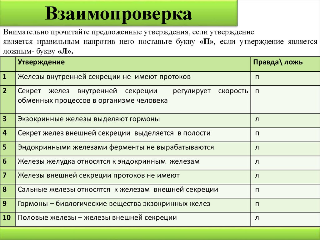 ВзаимопроверкаВнимательно прочитайте предложенные утверждения, если утверждение