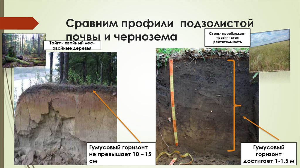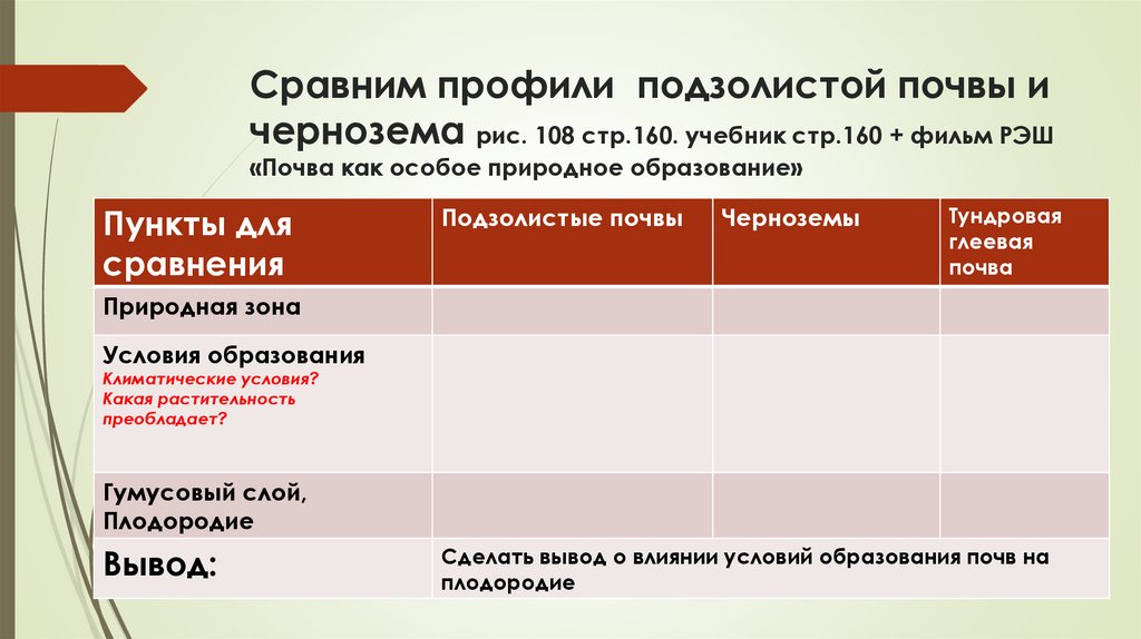 Сравним профили подзолистой почвы ичернозема рис. 108 стр.160. учебник стр.160 + фильм РЭШ