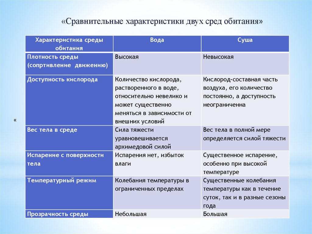 «Сравнительные характеристики двух сред обитания»Характеристика среды