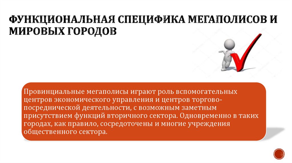 Провинциальные мегаполисы играют роль вспомогательныхцентров экономического управления и центров торговопосреднической деятельности, с возможным заметным