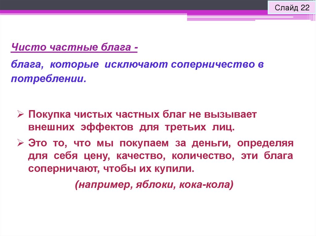 Слайд 22Чисто частные блага блага, которые исключают соперничество в