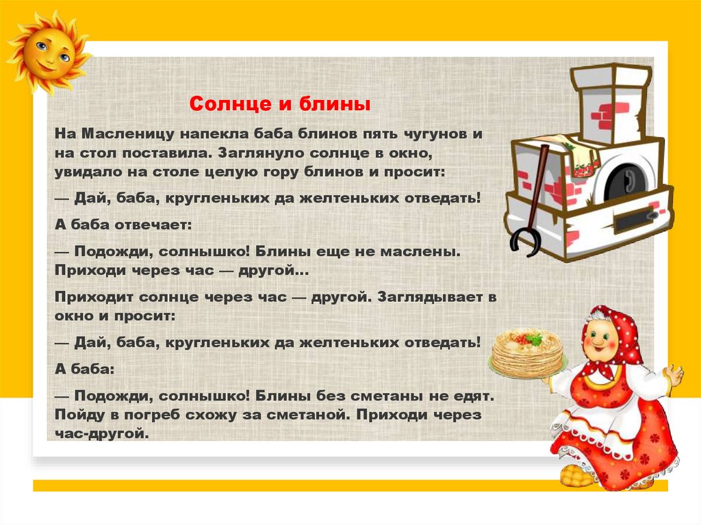 Солнце и блиныНа Масленицу напекла баба блинов пять чугунов и