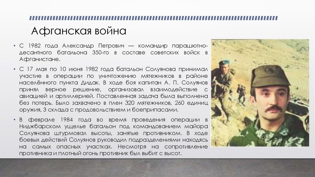 Афганская война• С 1982 года Александр Петрович — командир парашютнодесантного батальона 350-го в составе советских войск в