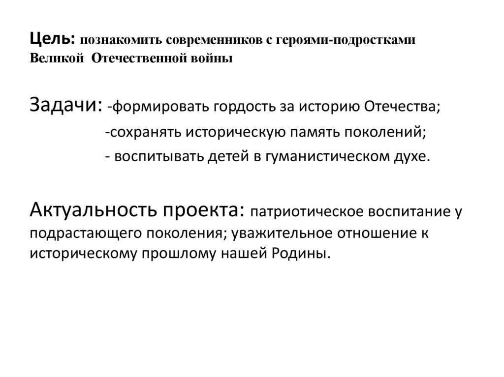 Цель: познакомить современников с героями-подросткамиВеликой Отечественной войны