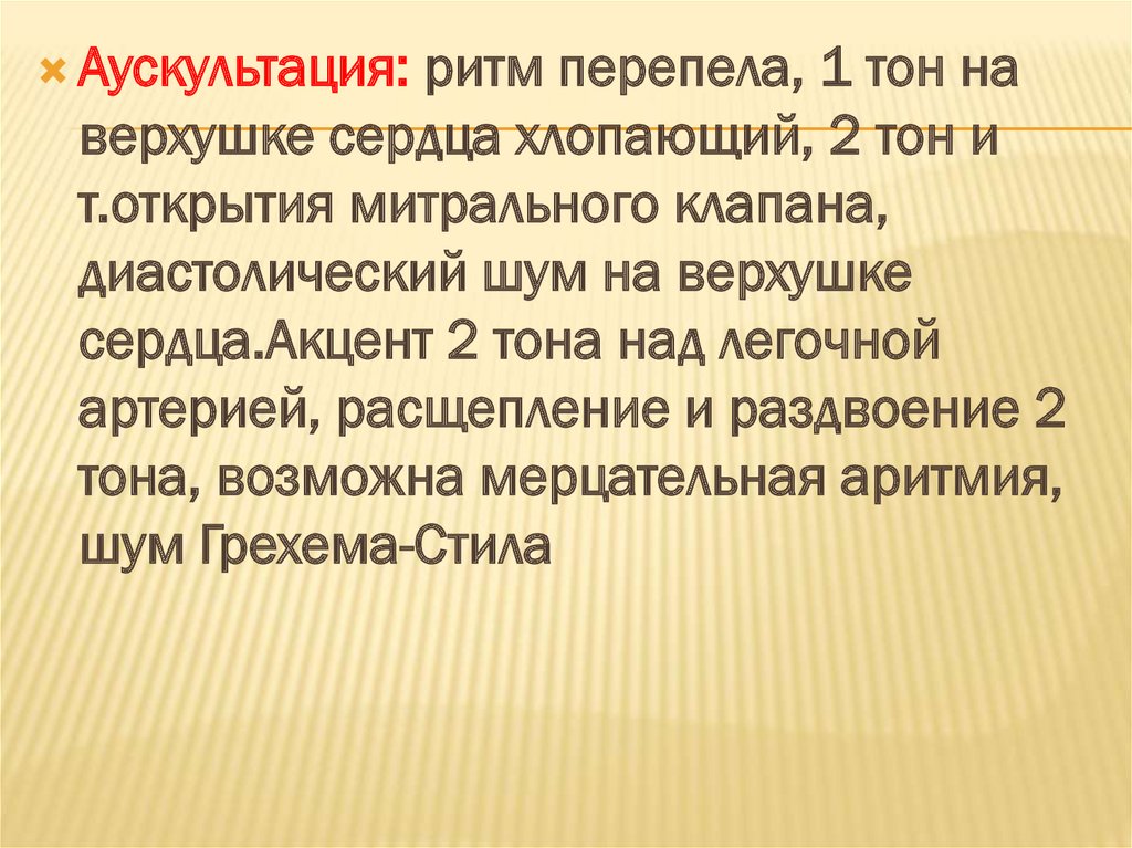 Аускультация: ослабление 1 тона, систолический шум