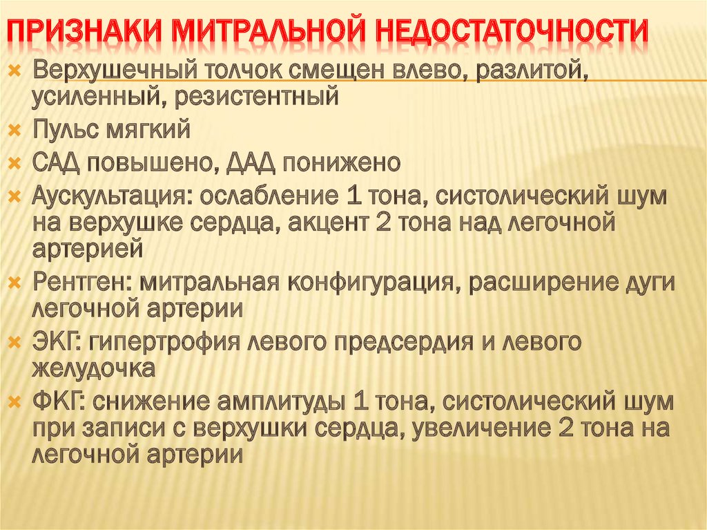 ПРИЗНАКИ МИТРАЛЬНОЙ НЕДОСТАТОЧНОСТИВерхушечный толчок смещен влево, разлитой,