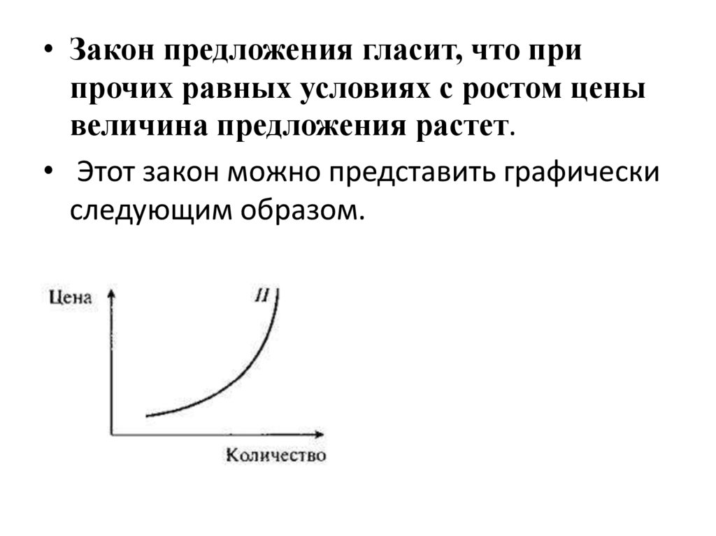 • Закон предложения гласит, что припрочих равных условиях с ростом цены