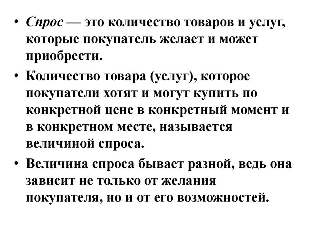 • Спрос — это количество товаров и услуг,которые покупатель желает и может