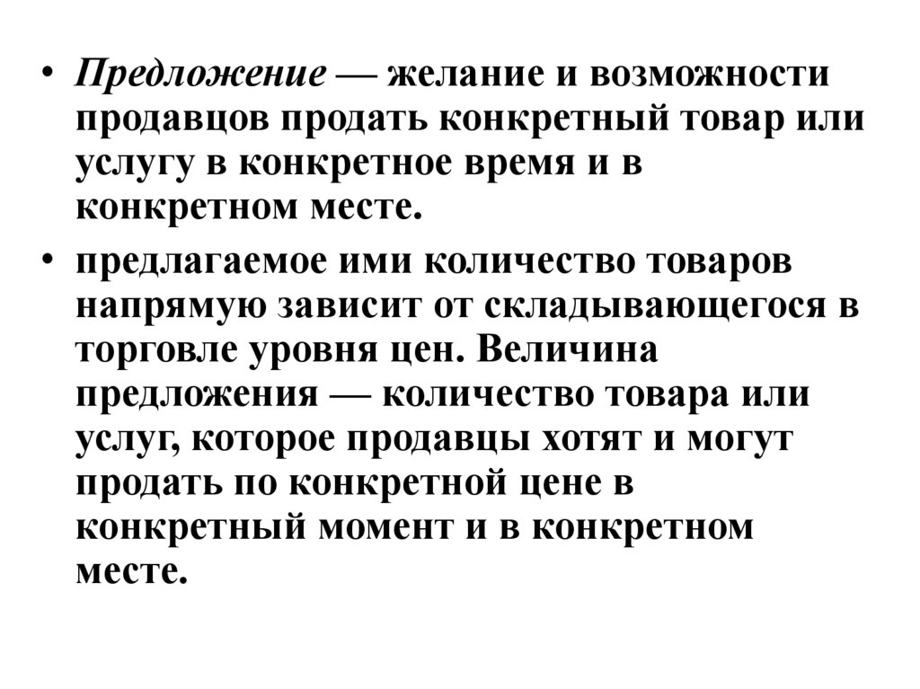 • Предложение — желание и возможностипродавцов продать конкретный товар или