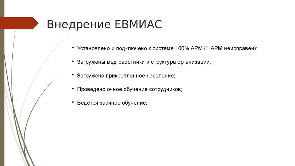 Внедрение ЕВМИАСУстановлено и подключено к системе 100% АРМ (1 АРМ неисправен);