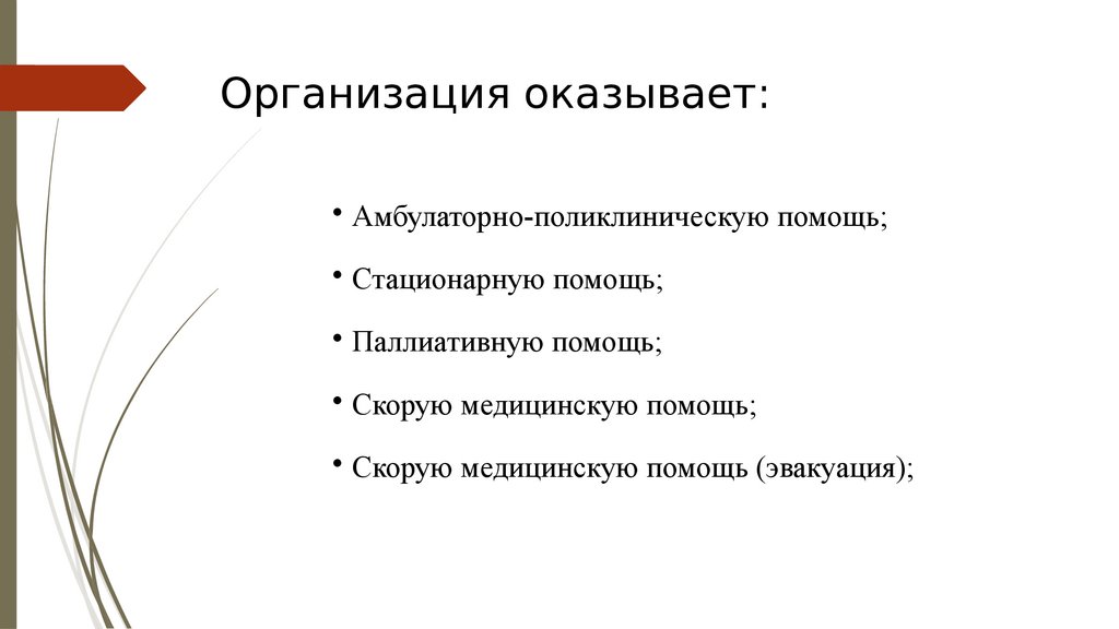 Организация оказывает:Амбулаторно-поликлиническую помощь;