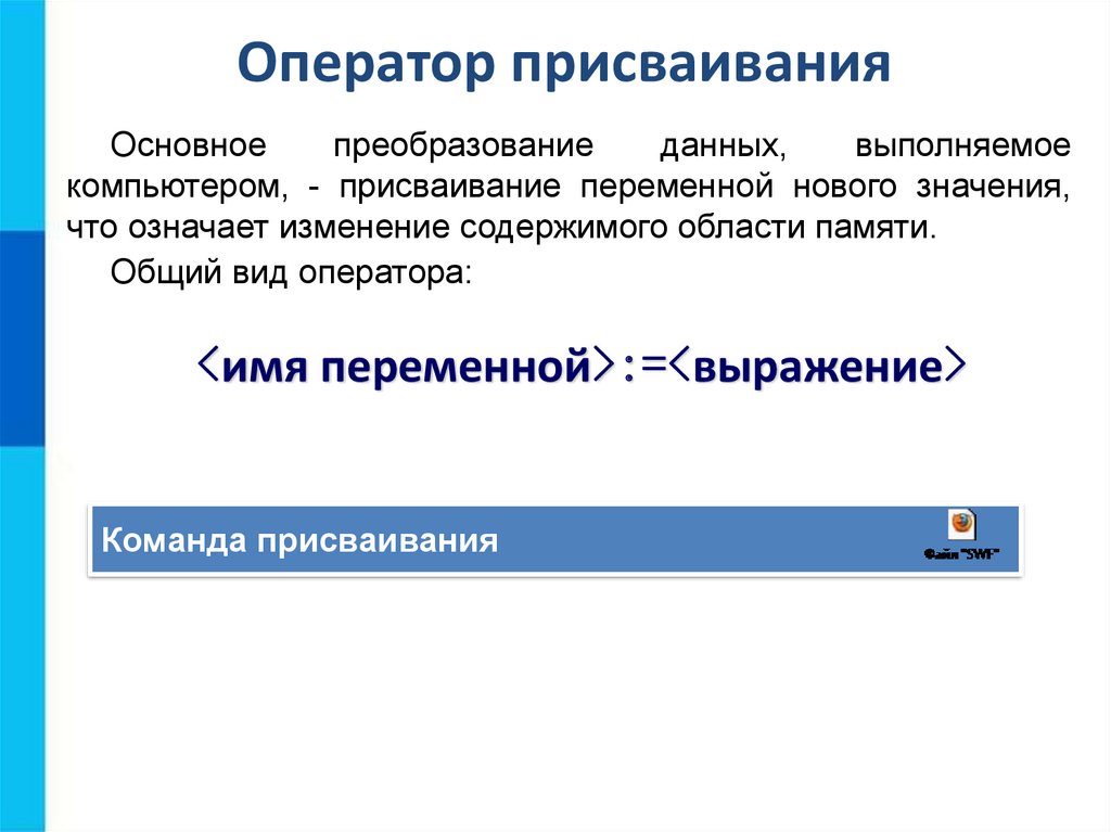 Электронные образовательные ресурсы1. http://files.school-collection.edu.ru/dlrstore/dec21a7c-cec4-4b7a-96d7d761c14a8582/9_76.swf - команда присваивания